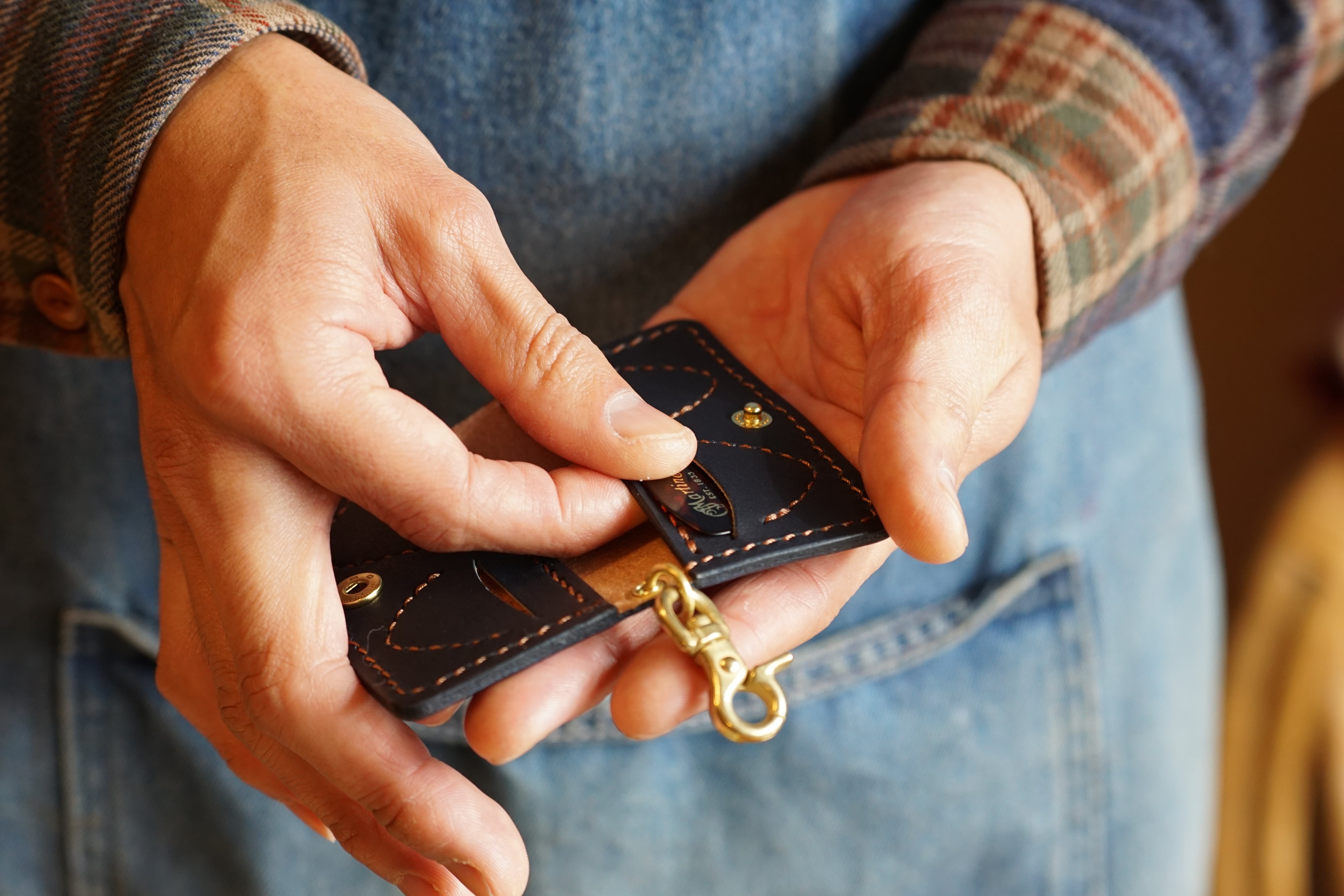 <革:ネイビー/ステッチ:ブラウン>